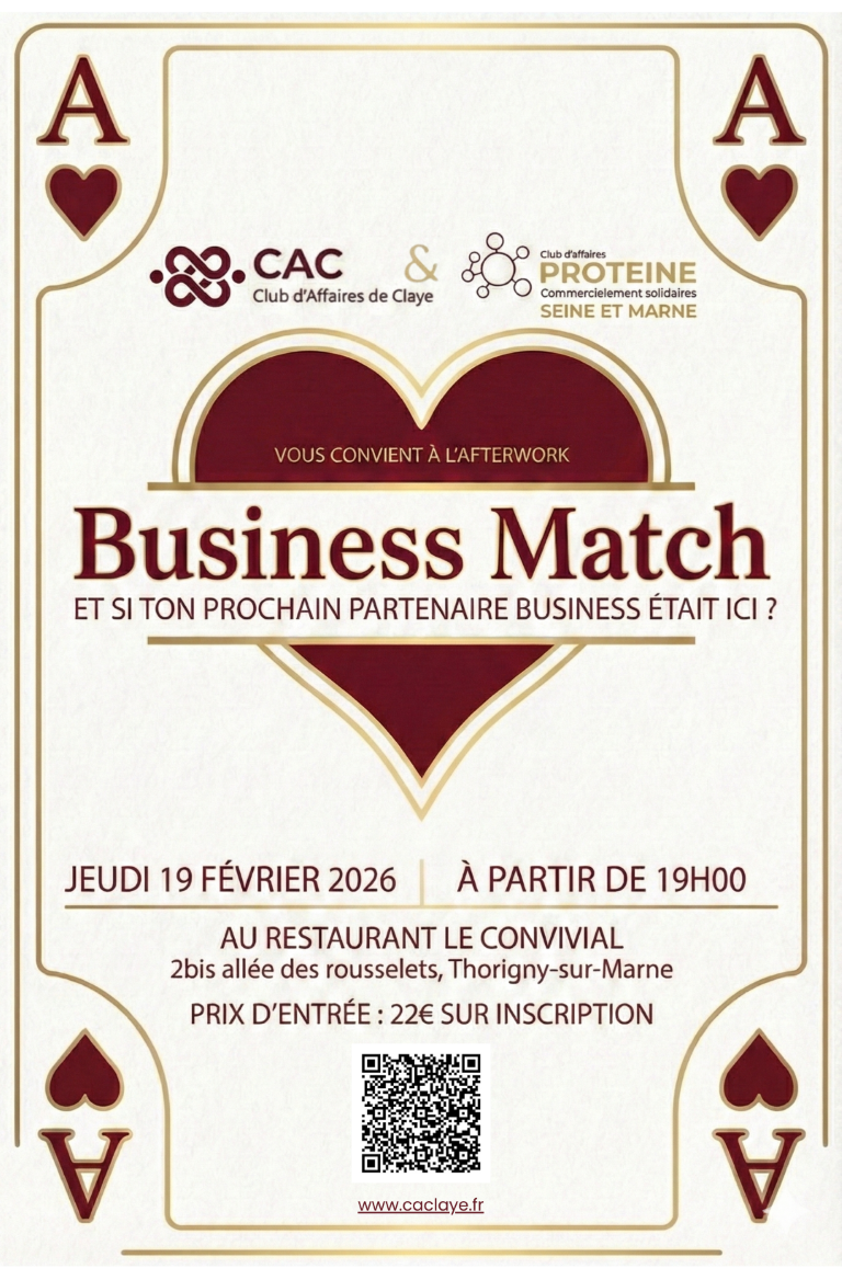 Le Club d’Affaires de Claye-Souilly et le Club Protéine de Chelles vous invitent à leur Afterwork Business Match au restaurant Le Convivial à Thorigny-sur-Marne jeudi 19 février 2026.
